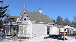It is a one-and-a-half-story wood-frame building which faces south. It has a U-shaped 63 by 57 feet (19 m × 17 m) plan. The listing includes a 21 by 30 feet (6.4 m × 9.1 m) frame garage.[2]