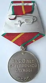 The Medal "For Impeccable Service" (Russian: Медаль «За безупречную службу») was a Soviet military award for long service awarded to deserving members of the military personnel of the armed forces of the USSR, of the Interior Ministry of the USSR and of the Ministry for the Protection of Public Order of the USSR, to recognise ten, fifteen and twenty years of faithful and impeccable service to the state.