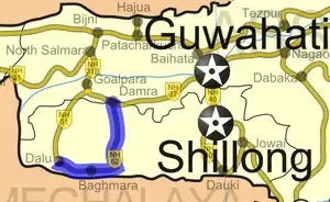 National Highway 62 (NH 62) is a National Highway in Northeast India. It starts from Damra in Assam and ends at Dalu, in Meghalaya. The highway is 195 km (121 mi) long, of which 5 km (3.1 mi) is in Assam and 190 is in Meghalaya. [1]