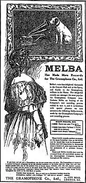 Melba made numerous gramophone (phonograph) records of her voice in England and America between 1904 (when she was in her 40s) and 1926 for the Gramophone & Typewriter Company[65] and the Victor Talking Machine Company. Most of these recordings, consisting of operatic arias, duets and ensemble pieces and songs, have been re-released on CD.[66] The poor audio fidelity of the Melba recordings reflects the limitations of the early days of commercial sound recording. Melba's acoustical recordings (especially those made after her initial 1904 session) fail to capture vital overtones to the voice, leaving it without the body and warmth it possessed – albeit to a limited degree – in life. Despite this, they still reveal Melba to have had an almost seamlessly pure lyric soprano voice with effortless coloratura, a smooth legato and accurate intonation.[66] Melba had perfect pitch; the critic Michael Aspinall says of her complete London recordings issued on LP, that there are only two lapses from pitch in the entire set.[67] Like Patti, and unlike the more vibrant-voiced Tetrazzini, Melba's exceptional purity of tone was probably one of the principal reasons why British audiences, with their strong choral and sacred music traditions, idolised her.[68]
