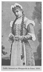 Stewart was born in Woolloomooloo, Sydney on 20 November 1858.[2] Her father, Richard Stewart, was an actor and singer[3] who, in 1857, married the actress "Mrs. Guerin", née Theodosia Yates, a great-granddaughter of the actors Richard Yates and Mary Ann Yates.[4] Nellie's mother came to Australia in 1840 and took leading parts in opera, such as the title role in Maritana when the opera was first produced at Sydney. Her two daughters by James Guerin became known on the Australian stage as Docy (for Theodosia)[5] and Maggie (for Margaret) Stewart. Theatre was thus in Nellie Stewart's blood, but she was brought up strictly. The family moved to Melbourne where Nellie first attended the old model school and afterwards, for a time, a boarding-school. She was taught fencing by her father, dancing by Henry Leopold and, later on, singing by David Miranda, father of Lalla Miranda.[6]