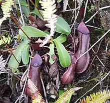 Nepenthes tobaica is very abundant in the Lake Toba region,[10] to the point where it is "difficult to avoid seeing it there".[5] N. tobaica is also known to grow in high altitude peat swamp forest near Lake Kerinci, at an altitude of 1100 m. At this location, the species grows alongside N. ampullaria, N. gracilis, N. mirabilis, N. reinwardtiana, and N. spathulata. The Nepenthes species and hybrids at this site exhibit high levels of introgression. The vegetation is dominated by species of the genera Rhododendron and Melastoma, as well as orchids and ferns. It is very stunted and dense, with few trees exceeding 3 m in height. It is somewhat reminiscent of the highland heath forests around Bareo in Sarawak, Borneo.[5]