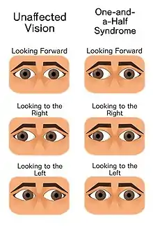 The one and a half syndrome is a rare weakness in eye movement affecting both eyes, in which one cannot move laterally at all, and the other can move only in outward direction. More formally, it is characterized by "a conjugate horizontal gaze palsy in one direction and an internuclear ophthalmoplegia in the other".[1][2] Nystagmus is also present when the eye on the opposite side of the lesion is abducted. Convergence is classically spared as cranial nerve III (oculomotor nerve) and its nucleus is spared bilaterally.