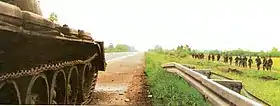 At 5:30 am, Croatian special police moved through a gap in the RSK defences, between the 98th Infantry Brigade facing Novska and the Tactical Group 1 (TG1) defending Jasenovac, disrupting the integrity of RSK positions,[77] and outflanking the 98th Brigade on the Novska–Okučani axis of the HV attack, where a battalion of the 1st Guards advanced along a secondary road parallel to the motorway, while one battalion from the 2nd Guards and the 3rd Guards Brigades each advanced east on the motorway itself, crushing the RSK defence.[60][78] At 1 pm, the commanding officer of the RSK 98th Infantry Brigade left the unit and reported to the Corps commander that the brigade was in disarray, citing heavy losses.[79] The HV attack aimed at capturing Jasenovac was a two-pronged advance of the 125th Home Guard Regiment supported by the special police south and east from Bročice and Drenov Bok.[60] The TG1 offered no significant resistance, and the HV captured Jasenovac between noon and 1 pm.[80][81] In the afternoon, the RSK authorities in Okučani permitted the evacuation of civilians;[82] however, the civilians were quickly joined by retreating elements of the 98th and the 54th Brigades. The TG1 retreated south across the Sava River.[83] After capture of Jasenovac, the HV 125th Home Guards Regiment and the special police advanced eastward along the Sava River.[78]