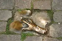 A statue titled "Belle", honouring the prostitutes of the world, was placed on the square in 2007. The plaque on this statue reads (in English): "Respect sex workers all over the world". The street also has a bronze relief of a hand caressing a female breast. The sculpture was set in the cobblestone in February 1993 by an anonymous artist.