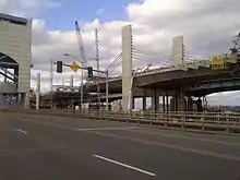 The old Pearl Harbor Memorial Bridge was replaced by a $554 million 10-lane extradosed bridge; the northbound span of which opened to traffic on June 22, 2012. Southbound traffic was shifted onto the new bridge, sharing the northbound span with northbound traffic until the new southbound span was completed in late 2015. Since the Gibbs Street Bridge in Portland, Oregon was redesigned from an extradosed span to a box girder bridge, the Pearl Harbor Memorial Bridge was the first extradosed bridge completed in the United States when it fully opened in September 2015.[3] The new bridge is the centerpiece of a $2 billion megaproject called the New Haven Harbor Crossing Improvement Program.