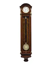 During the Industrial Revolution, the faster pace of life and scheduling of shifts and public transportation like trains depended on the more accurate timekeeping made possible by the pendulum.[3]: p.624 Daily life was organized around the home pendulum clock. More accurate pendulum clocks, called regulators, were installed in places of business and railroad stations and used to schedule work and set other clocks. The need for extremely accurate timekeeping in celestial navigation to determine longitude on ships during long sea voyages drove the development of the most accurate pendulum clocks, called astronomical regulators. These precision instruments, installed in clock vaults in naval observatories and kept accurate within a fraction of a second by observation of star transits overhead, were used to set marine chronometers on naval and commercial vessels. Beginning in the 19th century, astronomical regulators in naval observatories served as primary standards for national time distribution services that distributed time signals over telegraph wires.[13] From 1909, US National Bureau of Standards (now NIST) based the US time standard on Riefler pendulum clocks, accurate to about 10 milliseconds per day. In 1929 it switched to the Shortt-Synchronome free pendulum clock before phasing in quartz standards in the 1930s.[14] [15] With an error of less than one second per year, the Shortt was the most accurate commercially produced pendulum clock.[16][17][18][19][20]