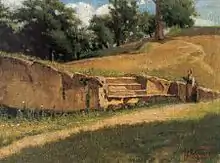 Sernesi served as a volunteer in the Second Italian War of Independence in 1859. Upon his return to Florence later that year, he made his first plein air landscape paintings.[3] Norma Broude says these works are characterized by "the azure and terracotta hues typical both of Tuscany's landscape and its fresco tradition" and says they reveal "a taste for rectilinear clarity in spatial and compositional organization".[3] Sernesi exhibited his painting Pastura in montagna ("Mountain Pastures") at the Brera National Exhibition in 1861 and at the Florentine Promotrice in 1862.[1] In 1862 he traveled to Naples and later to Ischia. He exhibited two paintings at the Milan exhibition in 1865.