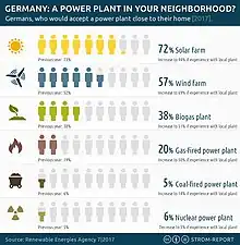 According to a 2017 national survey conducted for the German Renewable Energies Agency, of 1016 respondents 95% supported further expanding renewable energy.[70] Almost two-thirds of the interviewees agreed to renewable power plants close to their homes, with the support increasing further if respondents already had experience with such plants in their neighborhood. With solar farms it increased from 72 to 94%, with wind power from 57 to 69%, and with biofuels from 39 to 56%.
