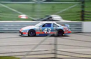 Joining in the Chrysler boycott of NASCAR due to the organizing body's ban of the Hemi engine, Petty spent much of 1965 competing as a drag racer. Petty Enterprises installed the Hemi in the new compact Barracuda and lettered "OUTLAWED" on the door. He crashed this car at Southeastern Dragway, in Dallas, Georgia, on February 28, 1965, killing an eight-year-old boy and injuring seven others.[10][11] Petty, his father Lee, and Chrysler Corporation faced lawsuits totaling more than $1 million, though Petty and his team came to settlements with the lawsuits within 1 month of the suits being filed.[12] Afterwards, a second Hemi Barracuda was built, this time with an altered wheelbase and eventually with Hilborn fuel injection. This car was lettered with a large "43 JR" on the door. The car was very successful, winning its class at the Bristol Spring Nationals and competing in many match races against well-known racers such as Ronnie Sox, Don Nicholson, Phil Bonner, Huston Platt, Hubert Platt and Dave Strickler. Even after returning to NASCAR once the Hemi was reinstated, Richard continued drag racing the 43 JR until early 1966. ± On February 27, 1966, Richard Petty overcame a 2-lap deficit to win his second Daytona 500 when the race was stopped on lap 198 of 200 because of a thunderstorm. This made him the first driver to win the event twice. In 1966, he won the first ever race at Middle Georgia Raceway (Morelock 200). Petty broke the half-mile NASCAR record for half-mile tracks with an average speed of 82.023 miles per hour during the 100-mile (160 km) event.[13] He would end up recording 4 wins there in his career, including one in 1970 in which he was very ill before the race. 1967 was a milestone year. In that year, Petty won 27 of the 48 races he entered, including a record 10 wins in a row (between August 12 and October 1, 1967). He won his second Grand National Championship. One of the 27 victories was the Southern 500 at Darlington, which would be his only Southern 500 victory. His dominance in this season earned him the nickname "King Richard". He had previously been known as "the Randleman Rocket".[14]
