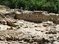 There is archaeological and metallurgical evidence of gold mining in the 'Golden Quadrilateral' of Transylvania since the late Stone Age.[7] The community, then known as Alburnus Maior, was founded by the Romans during the rule of Trajan as a mining town, with Illyrian colonists from South Dalmatia.[8] The earliest reference to the town is on a wax tablet dated 6 February 131. Archaeologists have discovered in the town ancient dwellings, necropolises, mine galleries, mining tools, 25 wax tablets and many inscriptions in Greek and Latin, centred around Carpeni Hill.[9] The Romans left Dacia in 271.