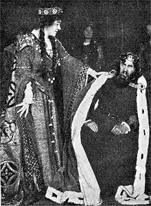 Gilbert's play first appeared in Fun magazine in 1874 after having been rejected for production by several theatre companies.[1][2] The first professional performance of the work was not until June 1891, a benefit matinée at the Vaudeville Theatre in London.[3] The play finally ran at the Court Theatre from 27 April 1892 to 15 July, about 77 performances,[4] with Decima Moore as Ophelia, Brandon Thomas as Claudius and Weedon Grossmith as Hamlet.[5] An amateur performance in 1900 featured P. G. Wodehouse as Guildenstern.[6] The play also enjoyed a production in New York City at the Murray Hill Theatre in 1900. A charity performance in 1902 featured Gilbert himself as Claudius, with Nancy McIntosh as Gertrude.[7] Gilbert again played Claudius at a charity performance in 1904 at the Garrick Theatre (also featuring Clo Graves, Francis Burnand, Edward Rose, Paul Rubens, Lady Colin Campbell, Madeleine Lucette Ryley, Col. Newnham Davis, Alfred Sutro, Alicia Ramsey, Edward Rose and Capt. Robert Marshall)[8][9][10] and in a 1908 revival at the Lyceum Theatre starring Marion Terry.[11]
