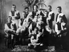 Slavia was founded on 2 November 1892 by medicine students in Vinohrady, Prague, as a sport club aimed at increasing sport activity among students. Initially the club focused on cycling, and expanded to football in 1896.[4] On 25 March of that year, Slavia won their first match against AC Prague 5–0. The captain of this team was Karel Freja.[4] Four days later, Slavia played against Sparta Prague, with the match finishing 0–0, this match being the start of the rivalry between these two clubs.[5][6] In 1905, Scottish manager and former Celtic player Johnny Madden brought new tactics and views on football from his home country to the club.