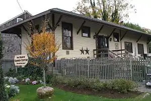 Photograph of the Sag Harbor freight station in its current use as the flagship tasting room for the Kidd Squid Brewing Company