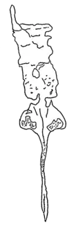 The long stem- or rod-like structure of the telson is ornamented on each side with tubercles (knobs), arranged in pairs, that gradually get flatter. The tri-lobed structure, sometimes dubbed the "post-telson" (though this structure was part of the telson), on the end of the stem is unique to Salteropterus.[4] The central lobe is larger than the other two, extending beyond them and having a ventral position. It is possible that this tri-lobed structure had the function of additional balancing in combination with the large flattened part before it.[1]