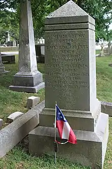 French was married to his first wife, Eliza Matilda Roberts of Mississippi, on April 26, 1853.[25] Together they had a daughter and a son who died in childbirth along with Eliza on June 13, 1857.[26] French was married again to Mary Fontaine Abercrombie of Alabama on 12 January 1865[14] but she too died, on 16 May 1900 at Atlanta, Georgia.[27] Together they had three children.[28]