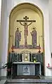 The area of the Sant'Anselmo complex open to the general public is the church which was consecrated on November 11, 1900. The church was consecrated by Cardinal Mariano Rampolla del Tindaro, assisted by twelve cardinals, sixteen archbishops and bishops, fifty-two abbots, rectors of all the major colleges of Rome, superiors general of the major religious orders, and all ambassadors accredited to the Holy See.[6] It is constructed of three naves, divided by granite columns, and includes one main altar and two side altars. The ceiling is a truss and the crypt was made of five naves with sixteen side altars. In 1952 there was a renovation of the church interior by architect Fritz Metsger. This saw the construction of elevated choir stalls for the monks in the transepts, the addition of an altar under the arch that allowed the priest to face either direction in celebrating mass, and the creation of three main mosaics by the German monk Radbodus Commandeur. The mosaics are located above the two side altars, as well as above the main apse which depicts the jeweled cross between angels and Saints Benedict and Anselm. Commandeur also completed the mosaic under the main altar covering the reliquary containing the relics of Saint Alexander of Rome. He also produced numerous pieces within the monastic enclosure of the College as seen in the gallery of photos below.[7] The paschal candle stick is modern but in the Cosmatesque style. The lower level has now been converted to the use of the library for the University. In the courtyard of the atrium, there is a bronze statue of Saint Anselm made in 1966 by Swiss sculptor Albert Wider from Widnau. From here, it is possible to see Santa Maria del Priorato of the Knights of Malta, which lies in an adjacent complex that is closed to the public. In the entrance to the Sant'Anselmo complex, reached from the atrium, is a Roman Orpheus mosaic from a second-third century home that was found during construction.[8][9]