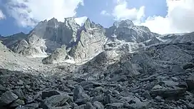 ![]() The Sciora group, from left to right: Sciora Dafora, Punta Pioda, Ago di Sciora (the needle), Sciora Dadent | |