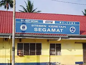 The station was originally established in 1909. In 1924, the station building was reconstructed with a bigger building on the same place. This station ceased operations on 28 April 2021 and was temporarily replaced by the Segamat Temporary Railway Station located 3.7 km (2.3 mi) away. The old station will be demolished to make way for a new station to be constructed as part of the Gemas-Johor Bahru Double Tracking and Electrification Project.[1] As of October 2023, the new station is already completed, with KTMB currently testing the station's internal and external lighting, passenger announcement and information systems, as well as the station's signalling. However due to the relatively slow progress of the electrified double-tracking project at the moment, the new station's launching is expected to be delayed until 2024.However trains now can pass through the station.