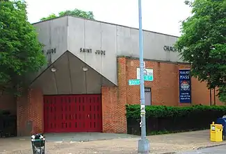 The Church of St. Jude, located at 3815 Tenth Avenue at the corner of West 205th Street in the Inwood neighborhood of Manhattan, New York City, is a Catholic parish church in the Archdiocese of New York. Established in 1949, the current sanctuary was built in 1975-76 and was designed by Clark & Warren in the Brutalist style. The School of St. Jude, located around the corner at 431 West 204th Street and built in 1949–51 to designs by Voorhees, Walker, Foley & Smith, was originally the sanctuary as well.[1] A two-story rectory at 411-445 West 204th Street was built in 1957 to designs by architect P. Goodman.[2]