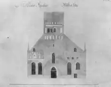 Further changes were made later in the same century, when architect Erik Palmstedt in 1777 redesigned the south side of the church courtyard in connection with the building of the stock exchange building on Stortorget.[38] At the same time, he also designed the stairwell attached to the south side of the tower, at the west end of the church; the stairwell was finished in 1778.[39] These and some other additions, later demolished, further underlined the Classical appearance of the church and its surroundings, in contrast to its medieval roots.[40] King Gustav III of Sweden wanted to go even further, demolish the entire church and replace it with a new church inspired by the Pantheon in Rome.[41]