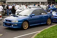 The 22B had the EJ22G engine (note, the internal Subaru material states the closed-deck block comes from a version III EJ20G). This means the displacement was increased from 2.0 L (1,994 cc) to 2.2 L (2,212 cc), bored up to 96.9 mm (3.81 in). Officially, it produced 280 PS (206 kW; 276 hp) at 6,000 rpm and 363 N⋅m; 268 lbf⋅ft (37 kg⋅m) at 3,200 rpm of torque, fuel feed by Electronic Fuel Injection and an IHI RHF 5HB turbocharger.[12] This car was given a unique color of blue and had fender flared widebody taken from the Peter Stevens designed WRC car, thus widening the width by 80 mm (3.15 inches). The car has a unique hood, front and rear fenders, a WRC-inspired front bumper and a unique adjustable rear wing. During assembly, a WRX Type R chassis was taken off the line. The fenders were replaced with the 22B STi fenders. The suspension is provided by Bilstein, while the brakes were four-pot front/two-pot rear STi calipers, painted red. The wheels were increased in size from the standard WRX Type R STI Version from 16- to 17-inches and the clutch was upgraded to a sintered twin clutch with a ceramic disk. The origin of the name 22B has been debated. The 22 referred to the 2.2-liter displacement and the B was thought to be for the Bilstein suspension. This would correlate with the idea that Subaru sells a Legacy Spec B, where the B represents the Bilstein suspension. However, the B is actually a Subaru internal code for Turbo. 22B is also hexadecimal for the number 555, in reference to State Express 555, Subaru's major sponsor in the WRC from 1993 to 2004.[13] The car's curb weight is 1,270 kilograms (2,800 lb).
