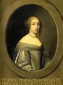 Susanne de Baudéan de Neuillant de Parabere, duchess de Navailles (1625-1700) was a French courtier. She served as Première dame d'honneur to the queen of France, Maria Theresa of Spain, from 1660 until 1664.
