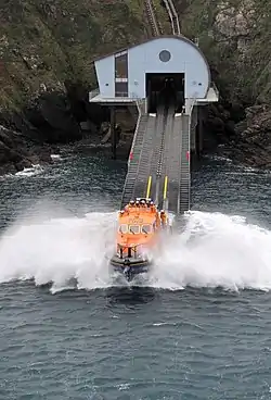 The Lizard Lifeboat Station can refer to several Royal National Lifeboat Institution lifeboat stations located on the Lizard in Cornwall, United Kingdom.[1] The first was established at the southernmost point of the peninsula in 1859. Since then successive stations have all been in operation at different locations on The Lizard. The current station is located at Kilcobben Cove 0.5 mi (0.80 km) east of the village of Lizard.[2]