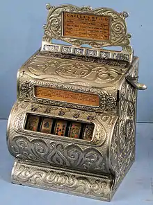 Trade stimulators were countertop machines widely used to encourage shoppers to indulge in a game of chance.[1] They became popular in American saloons during the 1880s, their use spreading to cigar, confectionery and general stores. Produced in a wide range of designs, they were developed during the same era as slot machines and were operated by inserting a coin and pulling a lever, the player standing to win prizes of cigars, cigarettes, candy and other goods if a winning combination came up. During periods when gambling was prohibited or in states where gambling was illegal, these machines could be used with little fear of prosecution.[2]