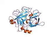 Urokinase, also known as urokinase-type plasminogen activator (uPA), is a serine protease present in humans and other animals. The human urokinase protein was discovered, but not named, by McFarlane and Pilling in 1947.[5] Urokinase was originally isolated from human urine, and it is also present in the blood and in the extracellular matrix of many tissues. The primary physiological substrate of this enzyme is plasminogen, which is an inactive form (zymogen) of the serine protease plasmin. Activation of plasmin triggers a proteolytic cascade that, depending on the physiological environment, participates in thrombolysis or extracellular matrix degradation. This cascade had been involved in vascular diseases and cancer progression.[6]
