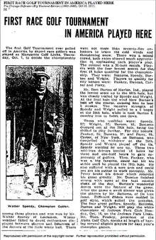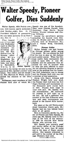 According to a Chicago Defender article, in 1921, Walter Speedy represented the Windy Golf Association with South Park Commissioners Foster regarding the participation of the Windy Golf Association's members in the City Golf competition to be held at Jackson Park. Members of Windy City Golf claim that discrimination prevented them from participating in the competition. When they applied for reservations, they were given permission to take part in the competition, but when they were about to "tee off," the golfers realized that their names had been changed and replaced in the registration books.[10]